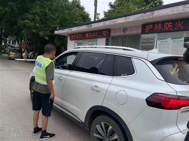 (工作人员对进山车辆进行扫码登记。记者 谭彬 摄)