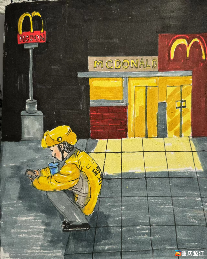 夜深了,快餐店门口还有一群等待派送食物的骑手。像外卖小哥一样,总有一群人努力工作在一线,他们虽然不起眼,但却不可或缺,让我们一起尊重付出、致敬劳动者。(冉旭 作)
