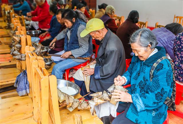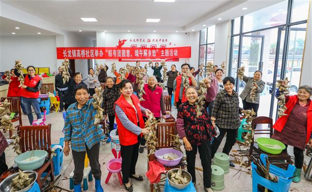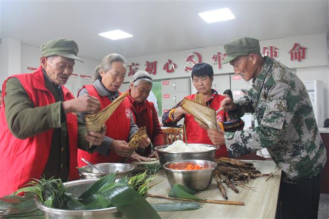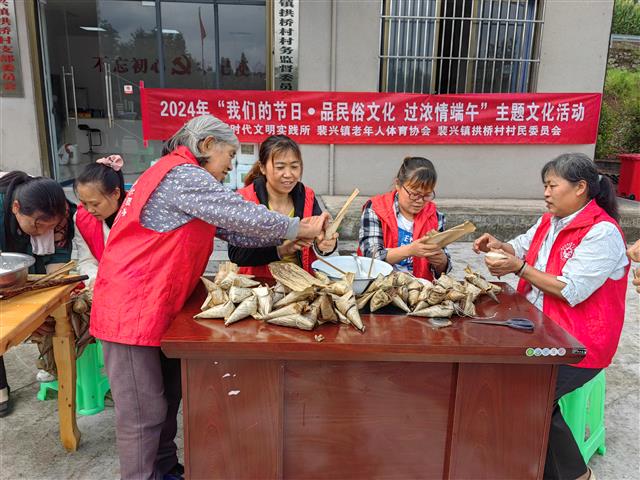 长龙镇高桥社区村民和社区干部一起包粽子。