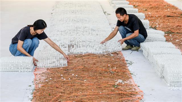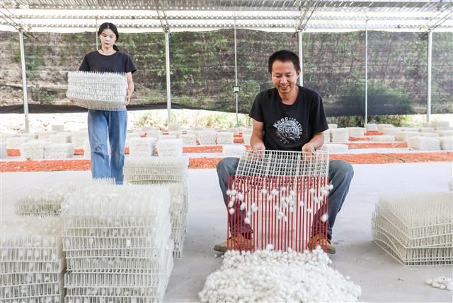 9月12日,五洞镇文龙村桑蚕基地,工人在收获第一批蚕茧。