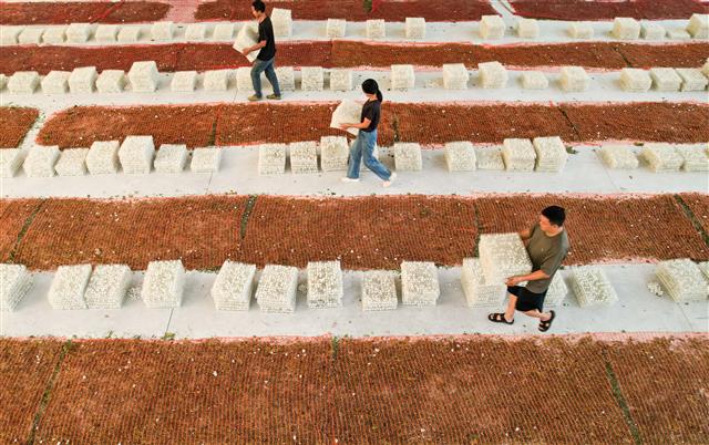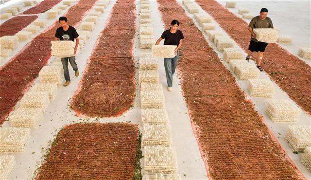 (搬运蚕茧。)