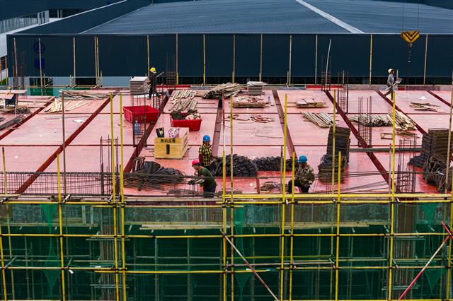 (工人正在抓紧施工。记者 魏瑞 摄)