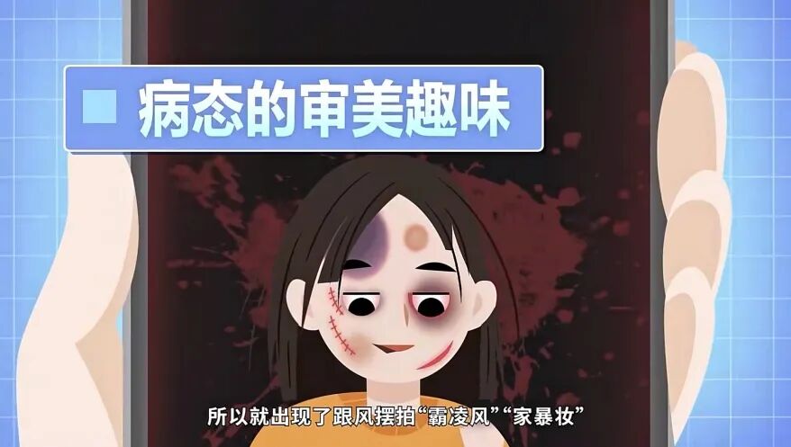 当大家沉迷于视觉的充盈,就会只追求感官的刺激,所以就出现了跟风摆拍“霸凌风”“家暴妆”,但这其实是戏谑别人的痛苦。这时候,人的价值观就已经被扭曲了。
