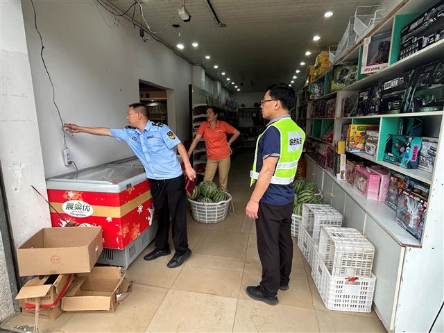 (工作人员检查辖区超市电器线路情况。)