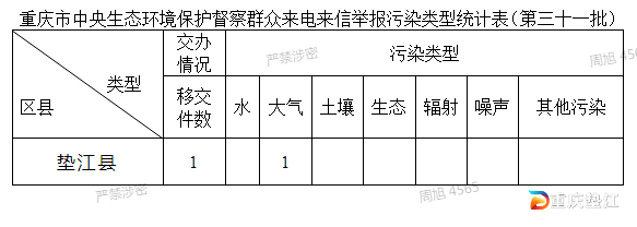 6月8日,中央第六生态环境保护督察组向重庆市交办第三十一批群众信访举报件113件,涉及我县1件,其中来电举报1件,来信举报0件,重点交办件0件。截至6月8日,中央第六生态环境保护督察组向我县共交办信访举报件52件,其中来电举报36件,来信举报16件,重点交办件4件。