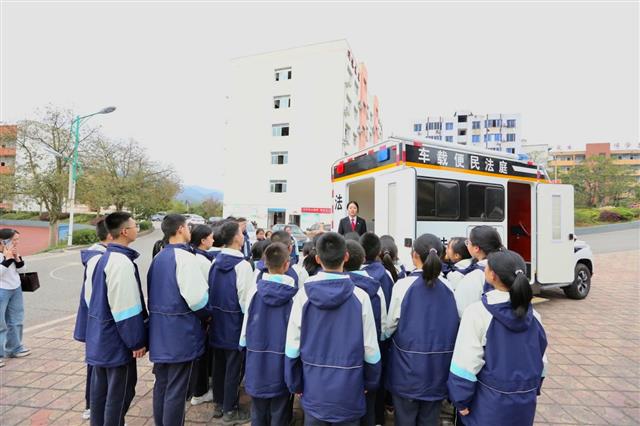 随后,干警还向同学们发放了普法宣传资料,一一解答同学们的法律困惑,并组织学生代表参观体验车载便民法庭,让部分同学体验了模拟庭审。