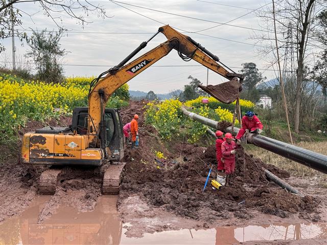 3月12日下午,澄溪镇胜利村的田间地头,鼎发集团的施工人员正忙着卸载、运管、布管、焊接、下沟......大家各司其职,井然有序地铺设管道。