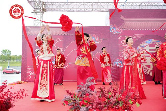 垫江县第三届中式集体婚礼在三合湖湿地公园举行,共有1对金婚老人和21对年轻新人参加。婚礼现场,新人们身着大红传统服装入场,依次行结发礼、合卺礼、执手礼、诰天礼等中式婚礼礼仪,全体新人共同宣读婚姻誓词,许下了爱国爱家、相守一生的郑重承诺。