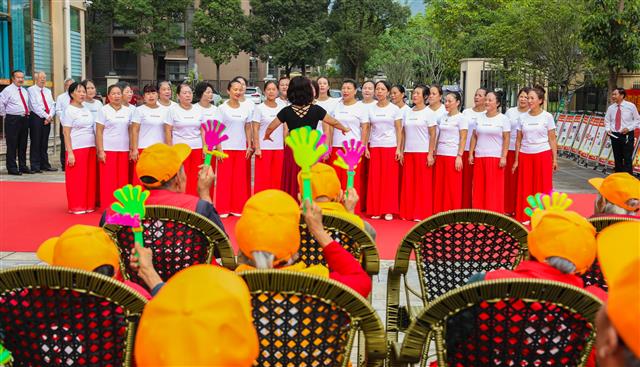 双百年养老院老人观看社区带来的文艺节目。记者 龚长浩 摄