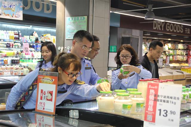 两地市场监管局工作人员检查超市商品商标使用情况。记者 王喜 摄
