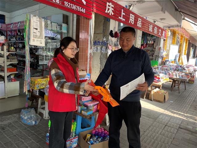 工作人员向门店负责人宣传保护未成年人的相关知识。记者 谭彬 摄