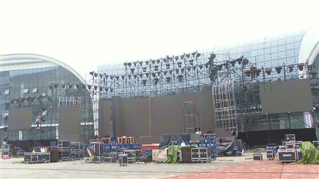 在舞台施工现场看到,安装工人们正在对音响、灯光等设备进行细节调试,确定舞台框架、填补框架空缺、安装舞台灯光、准备舞台装饰……每一步都做得一丝不苟。眼下,整个舞台已初具雏形。
