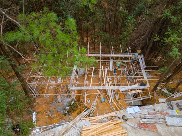 记者来到施工现场,只见露营基地已初具雏形,工人们正有条不紊地清理露营平台旁的树木和杂草,现场一派忙碌景象。