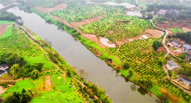 柑橘连片的龙溪河沿岸。记者 龚长浩 摄