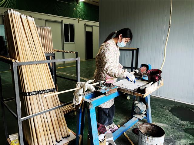 工人正在对台球杆进行上漆。记者 谭彬 摄