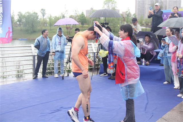 志愿者为选手颁发完赛奖牌。记者 王俊杰 摄