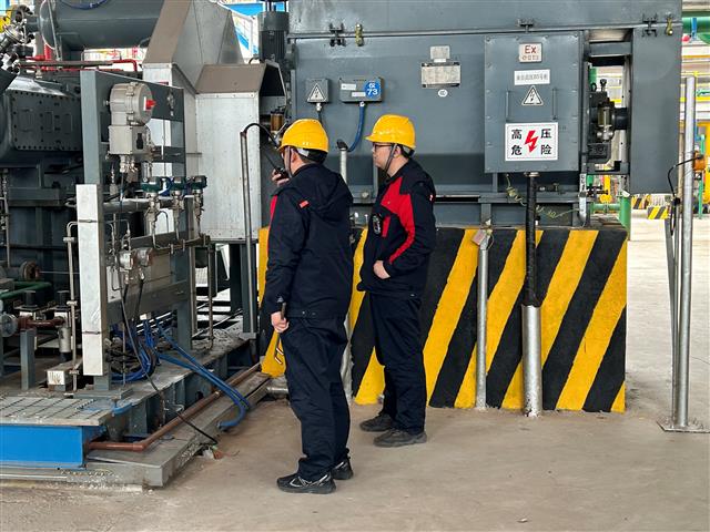 除此之外,开展定时巡检也是二期中控室工作人员的职责之一。他们每天会定时开展巡视,进入现场仔细检查各个机器设备运行状况,确认温度计、压力表、液位计等指示正常及无“跑冒漏滴”等异常情况发生,并将了解到的情况使用对讲机及时向中控室汇报,中控室收到消息后与屏幕监控数据进行核对,保证现场数据与监控情况一致。