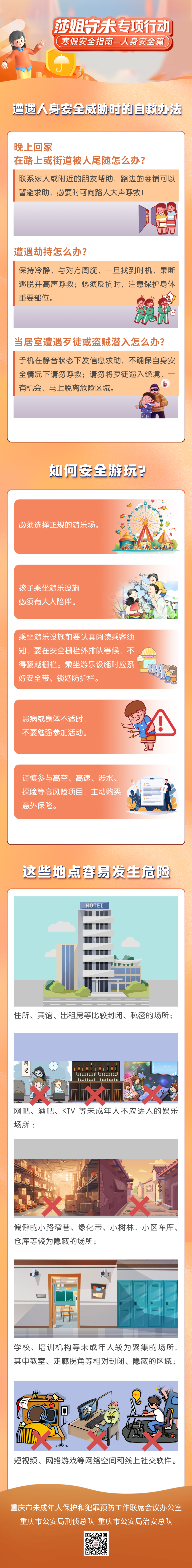 为进一步推动我市“莎姐守未”专项行动入微入细,市未成年人保护和犯罪预防工作联席会议办公室会同成员单位联合重庆政法微信公众号,推出“寒假安全指南”,引导提高同学们寒假期间自我保护意识和防范能力,确保度过一个平安、健康、快乐、充实的假期。守护安全,我们一路同行。