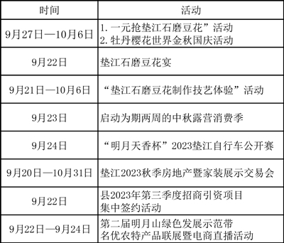 不仅如此,9月20日—10月31日,我县将举办垫江2023秋季房地产暨家装展示交易会;9月22日,举办垫江县2023年第三季度招商引资项目集中签约活动,届时将有总投资200多亿元的60个项目集中签约,涵盖先进材料、食品药品及农产品加工、汽摩装备、现代农业等多个领域;9月22日—9月24日,将开展第二届明月山绿色发展示范带名优农特产品联展暨电商直播活动,邀请明月山绿色发展示范带毗邻市区县名优农特产品企业及品牌餐饮企业集中展示展销,并通过抖音、微信视频号等平台,在联展现场开展线上直播带货,扩大名优农特产品影响力,促进线下线上融合消费。此外,节会期间,我县还将同步开展“垫江石磨豆花”预制菜研发激励、“垫江石磨豆花示范店”打造活动,着力以节会带动“垫江石磨豆花”特色产业链构建,推动经济高质量发展。