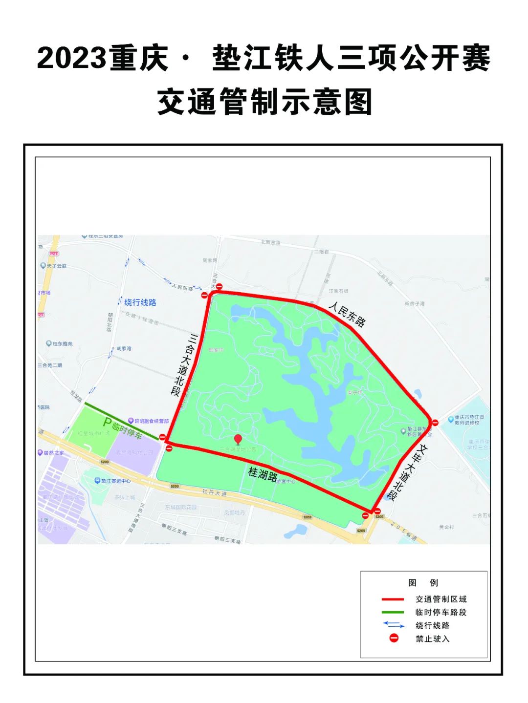 5月13日9时至5月14日14时,比赛赛道车行道和两侧人行道以及三合湖环道(含停车场)禁止车辆停放。