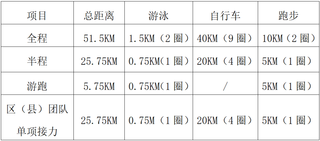 1.各代表队3名选手分别完成游泳、自行车、跑步单项接力赛;