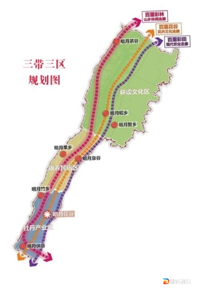 “三区”三大主题板块,则根据自然资源条件现状和基础特征,将整个垫江明月山乡村振兴示范带划分为三个主题特色片区,彰显垫江最具代表性的文旅、产业特色,同时确定各自的发展主题,共同做大明月山品牌。