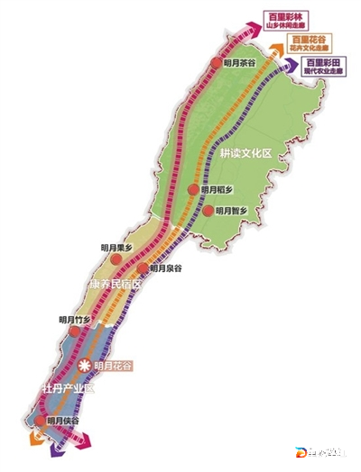其中 “三带”,即打造百里彩林——山乡休闲走廊、百里花谷——花卉文化走廊、百里彩田——现代农业走廊;“三区”,即打造牡丹产业区、康养民宿区、耕读文化区;“一月”,即打造明月花谷·牡丹主题的旅产融合示范区;“七星”,即打造明月茶谷(东印茶山)、明月稻乡(双河口村)、明月泉谷(坛子口) 、明月果乡(金桂果园)、明月智乡(明月村)、明月竹乡(楠竹山) 、明月侠谷(天池坝)。