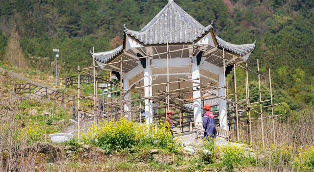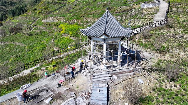 3月10日,在恺之峰旅游区,工人正抓紧时间修建观光亭和餐饮小吃店。