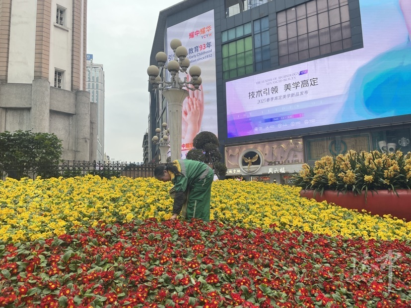 2月24日,记者在解放碑步行街看到,绿化工人正分工合作,清理绿地内损伤的植物败叶及杂物,并及时对植物进行补种,确保时令花卉的整体美观度及存活率,达到较好的观赏效果。此外,绿化工人还对乔木枯枝进行了修剪和定型,使它们更加整齐美观,提升景观协调性。
