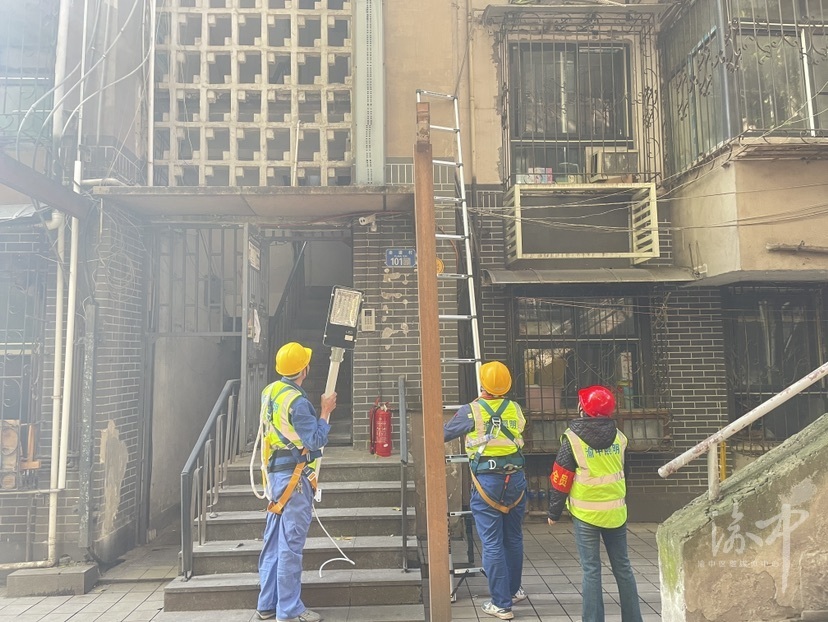 3月24日,记者在渝建村100号看到,几名安装工人正头戴安全帽、身着安全绳,分工配合协作,对老旧居民楼加装LED路灯。钻孔、安装、固定、接电、调试……不一会儿功夫,几台崭新的路灯便安装完毕。