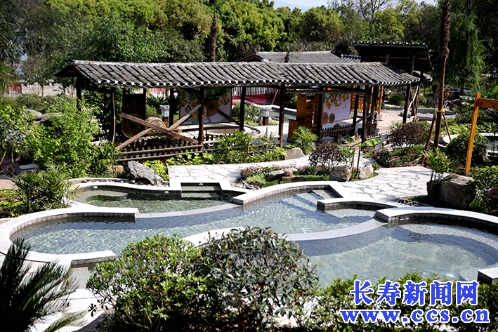 4月20日,在长寿湖景区的乐温院子,20余个温泉池,水流潺潺,和周围环境浑然一体。