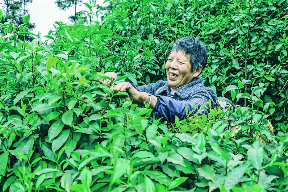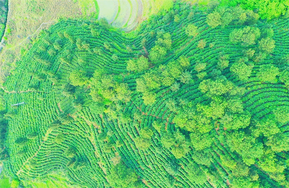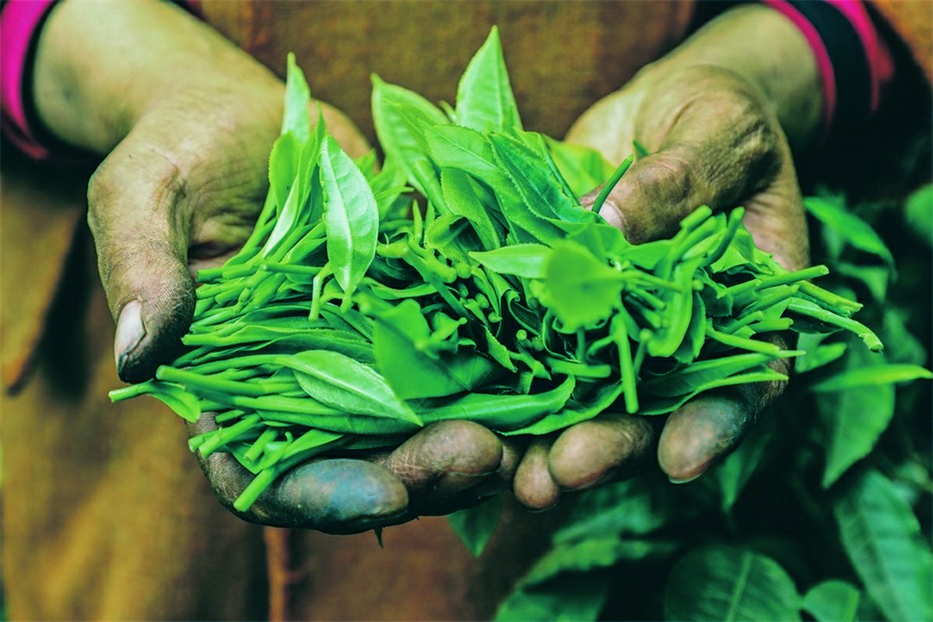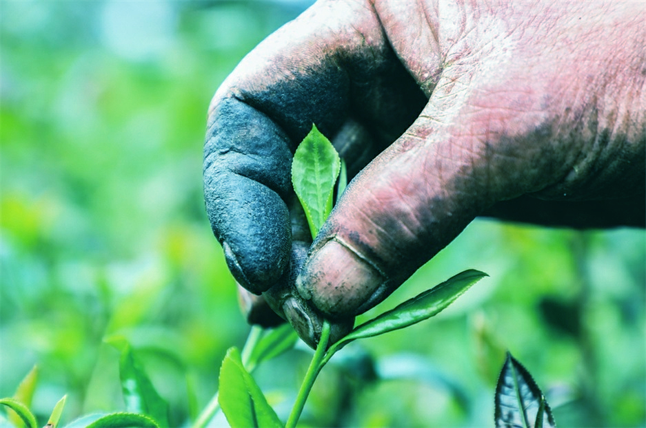 百亩茶园,碧涛如覆,俯瞰仿似一只振翅舒翼的绿鹤,簇簇树冠则是其丰润的羽毛。采茶要趁早,清晨未干的露水会使茶叶更加肥润,日光炽烈后养分便会渐渐消耗。趁春日温润的阳光尚不猛烈,我们下到茶园之中,尚未蒸发的露水如粒粒珍珠,凝在通透的绿芽上,山间潮湿清新的空气似阵阵幽香,萦在柔嫩的茶树间。采茶是个体力活儿,亦是技术活儿,熟练的茶农们各背一个木篓,指甲迅速一掐,茶叶便自然断落,被抛进身后的筐里。经年采茶的人,手被汁液染成黑色,指端是坚硬的老茧,掌上是粗糙的纹理,岁月风霜从茶园刻入了双手,指缝凝着劳作的艰辛,也捧出勤劳致富的幸福。