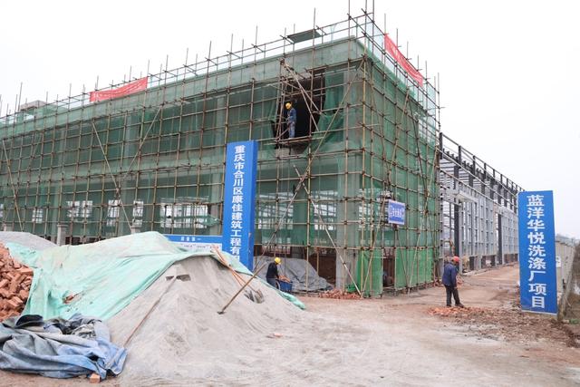 在重庆蓝洋华悦洗涤服务有限公司的建设工地上,厂房主体已经封顶,工人正在进行厂区装修工作。该项目总投资0.8亿元,占地22亩,今年7月一期工程将建成投产。