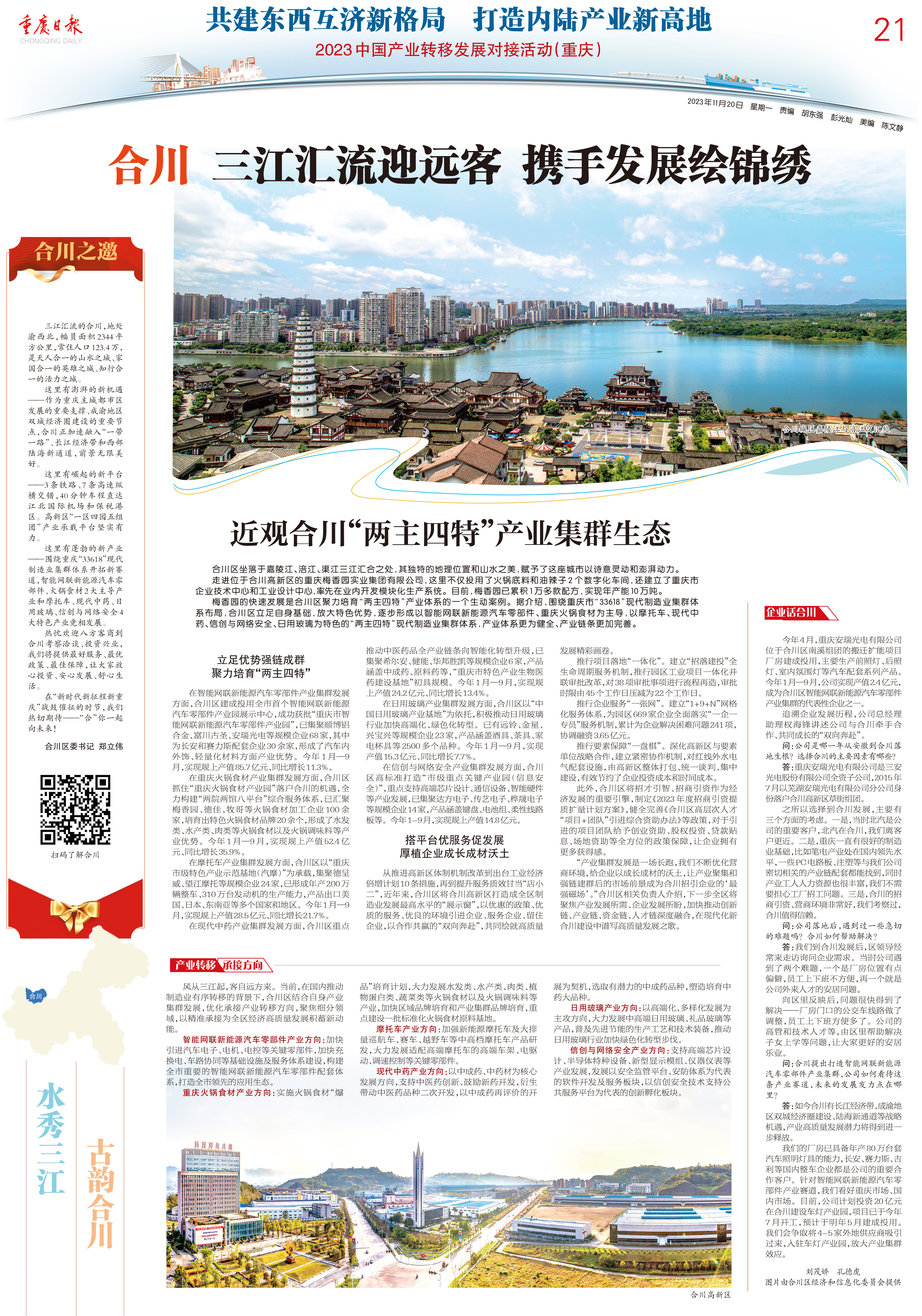 11月20日,由工业和信息化部、重庆市人民政府共同主办的“2023中国产业转移发展对接活动(重庆)”在重庆悦来国际会议中心举行。合川区在活动中进行了产业推介,签约了合作项目,借力此次对接活动平台诚邀八方客商到合川投资兴业、共谋发展。当天,重庆日报刊发整版合川推介文章《合川 三江汇流迎远客 携手发展绘锦绣》。